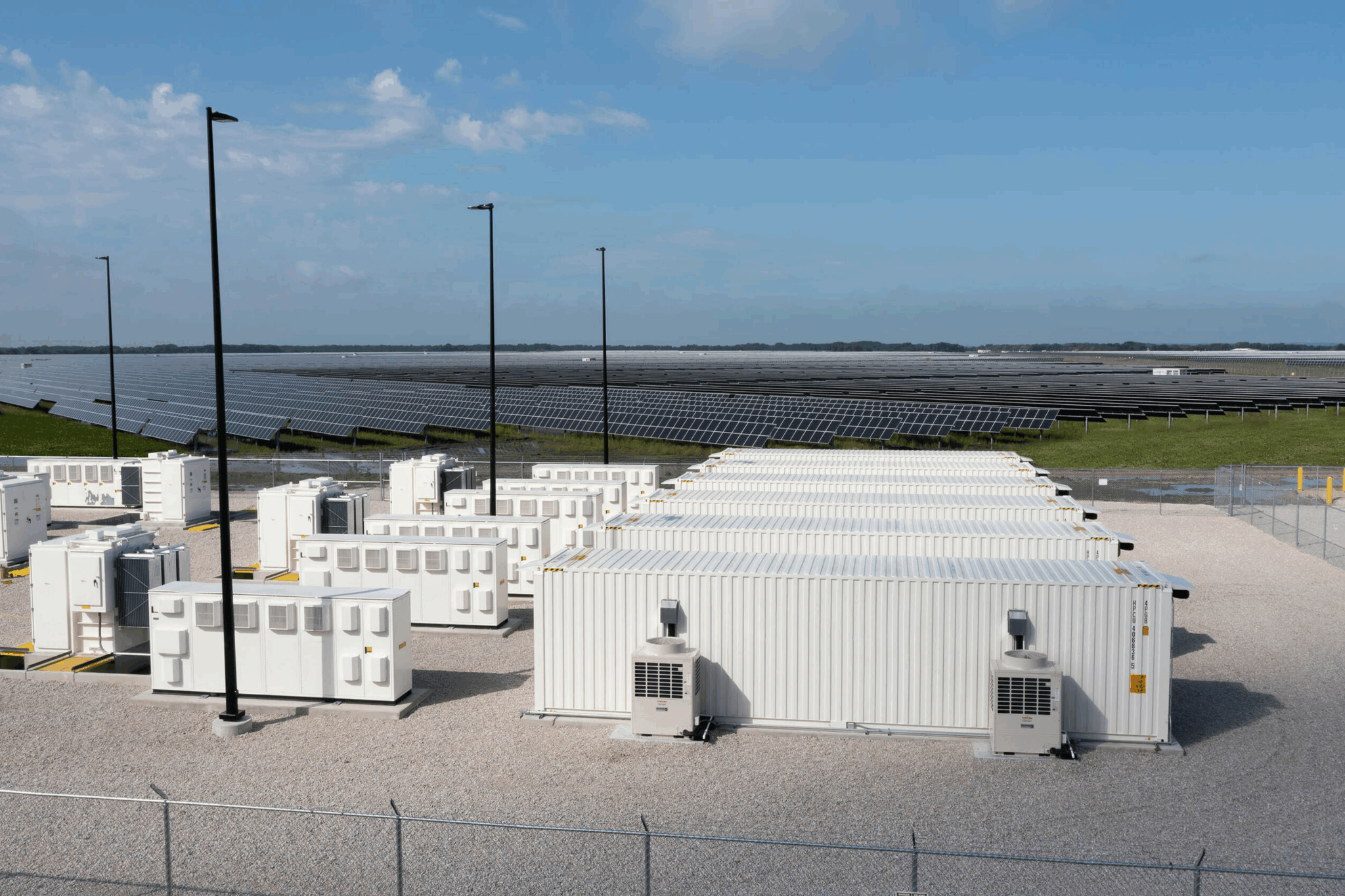 Energy storage facilities pair containerized systems with essential site infrastructure. Inside each container, battery modules are supported by a battery management system (BMS), thermal controls, safety systems, and inverters to convert power for grid use. At the facility level, balance-of-system components like transformers, switchgear, and communications equipment connect the storage system safely and reliably to the electric grid.